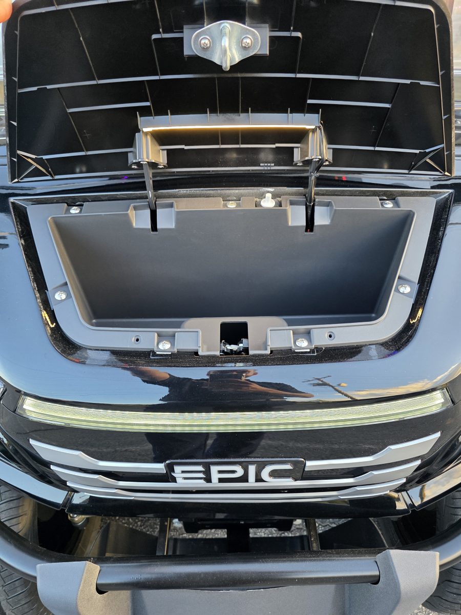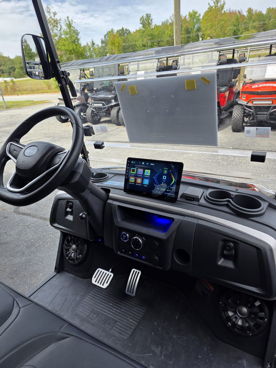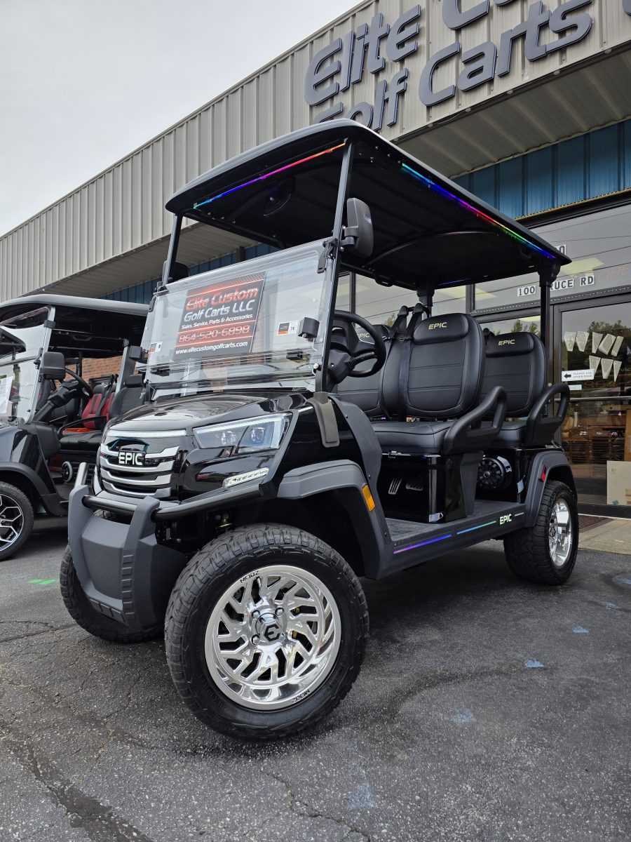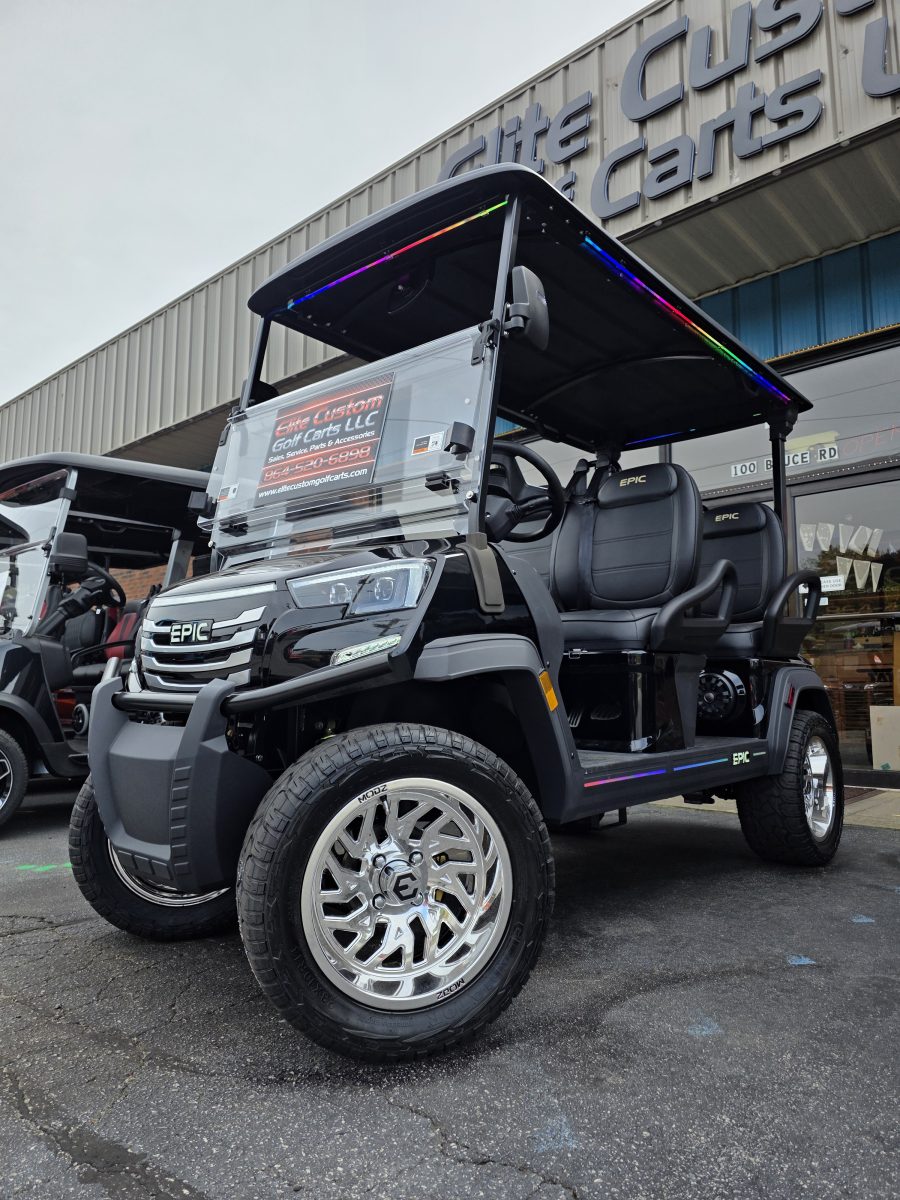 The brand new EPIC E40FX is the best golf cart on the market today! Furnished with every imaginable feature, the forward-facing four-seater EPIC E40FX comes in six stylish colors and two height options. Premium 14” wheels and street-ready tires provide a solid foundation for every journey on every terrain, no matter what lift height is selected. With an abundance of storage, superior built-in marine-grade sound system and speakers, and stunning accent lighting, this EPIC golf cart illuminates the possibilities for fun and adventure.